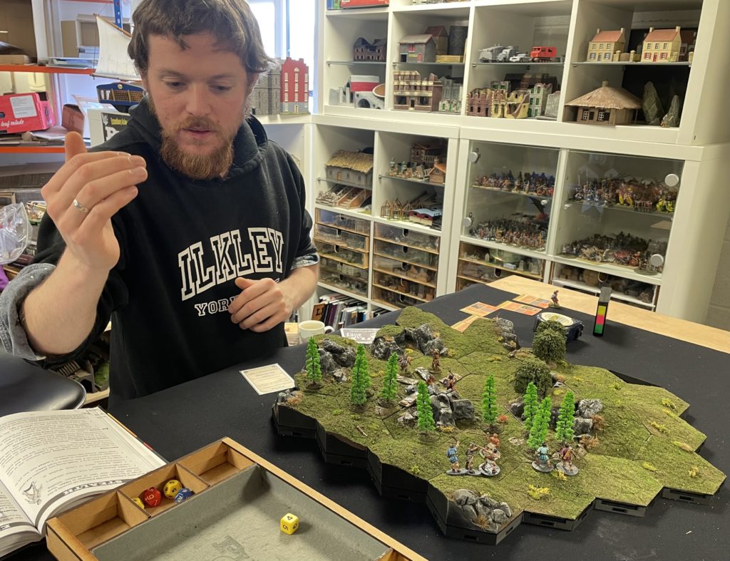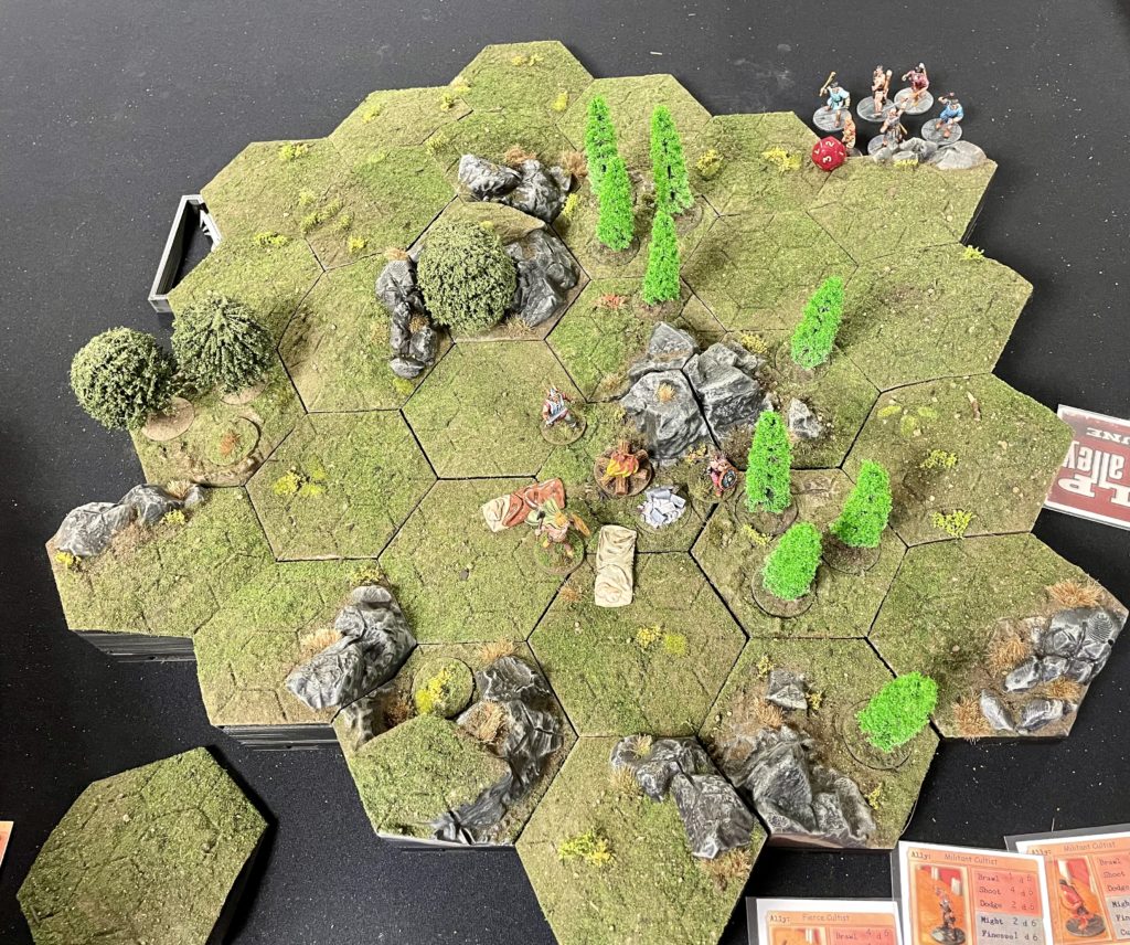 A month or so ago I came across a terrain system for 3D printing in MyMini Factory called Hexhog Tabletops. The system is made up of roughly 3″ across the flats hexagonal tiles that are clipped together with OpenLock clips to make up very detailed model landscapes. Hexhog offer a completely free set of files called Campfire Confusion that you can print out to try the system. The terrain that I am using for this game is made from these free files. I did a review / painting & modelling guide a couple of weeks ago that you can read here. The set even comes with some scenario ideas for playing a D&D / Pathfinder scenario using the free tiles.