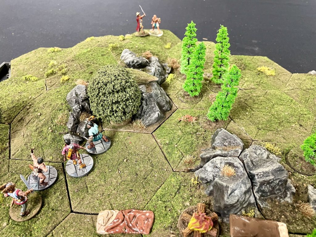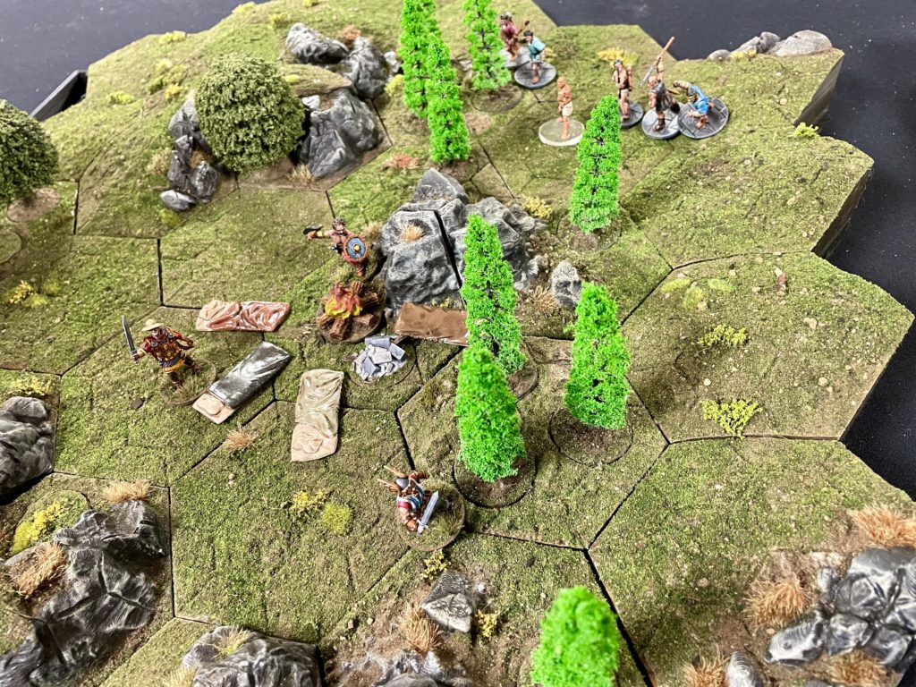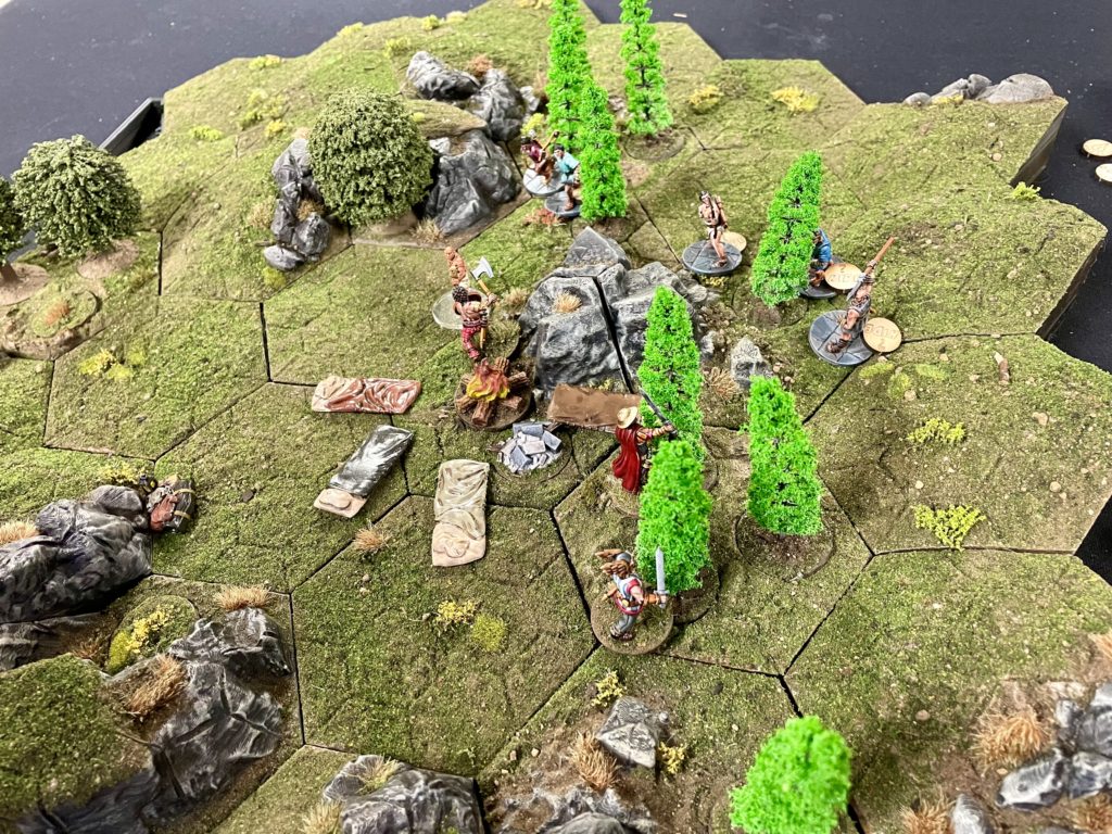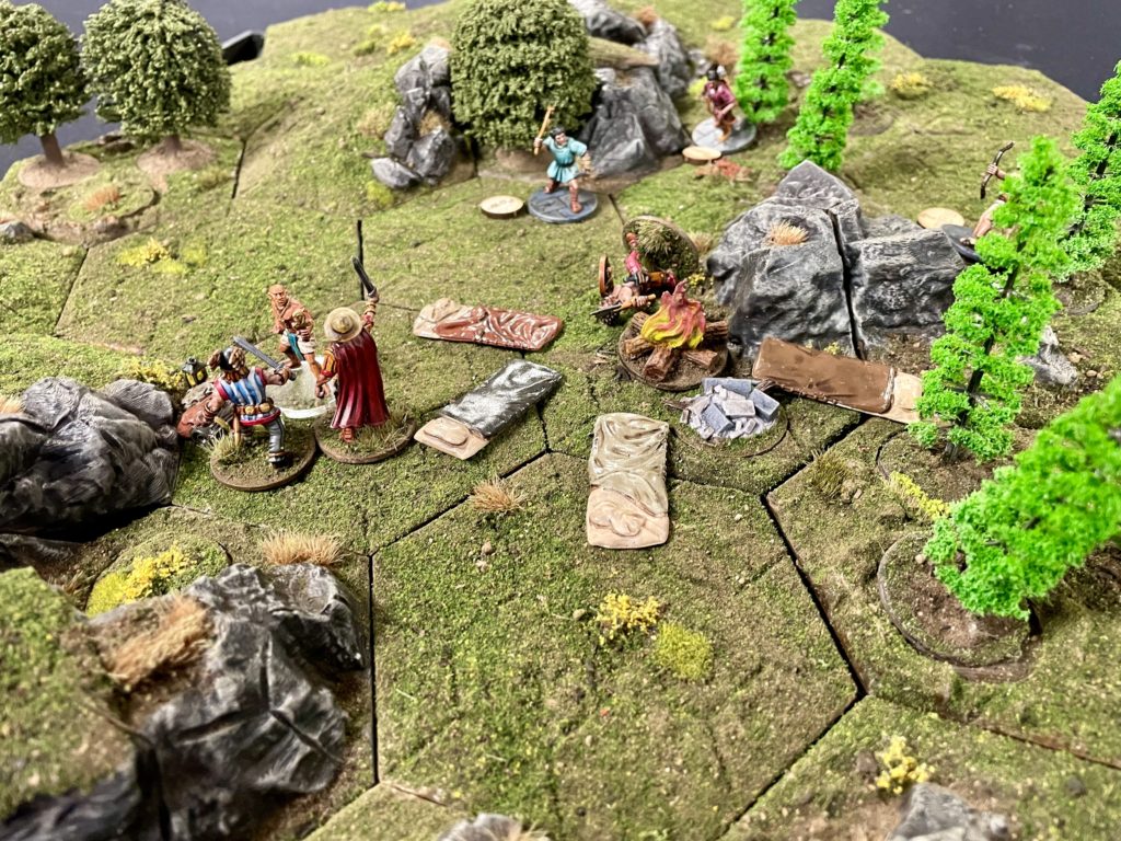 The defending players characters are minor plot points. If a character is ‘down’, as an action an attacker can attempt to interrogate them to find the location of the major plot point. If the peril and challenge is overcome, the major plot point (the relic) is placed by the defender within 6″ of the campfire. Who ever is in control of the relic at the end of the six turn scenario wins the game.
