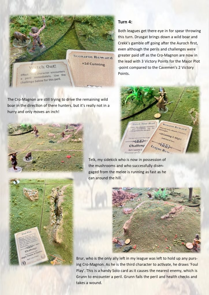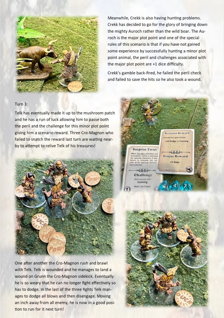 The scenario is about food… right up there with shelter and water if you are a caveman (or women). The plot points in this scenario are food items. Two of the minor plot points are static, they represent areas that can be foraged for mushrooms, berries, honey or nuts. These act as normal plot points. A peril has to be overcome before attempting the challenge. They could be located near some quicksand or other dangerous terrain feature, or maybe there is another animal after the same food! The other plot points are animals to be hunted, the minor plot points are small animals like a boar and the major plot point is a large animal like an Auroch. After all characters have activated, these animals move. They move D8″ away from the front of the nearest character. The large animal (major plot point) is more difficult and more dangerous to hunt, so if you have not already successfully hunted a small animal plot point you must add one dice to the associated peril and challenge. This makes a difficult choices!!