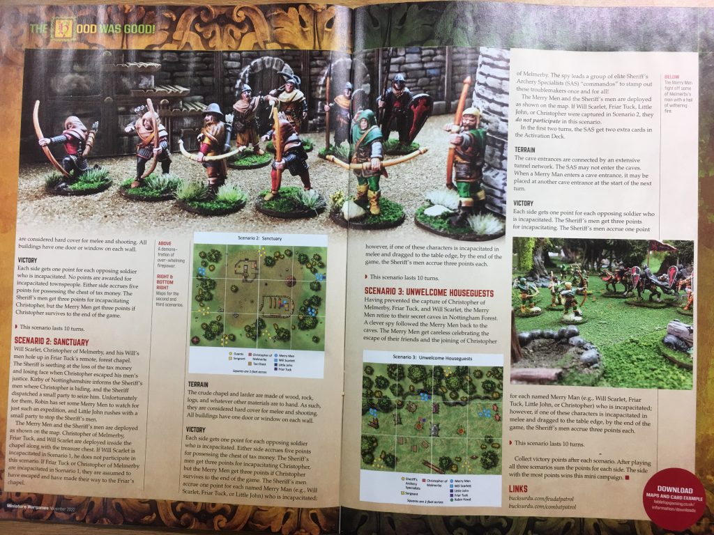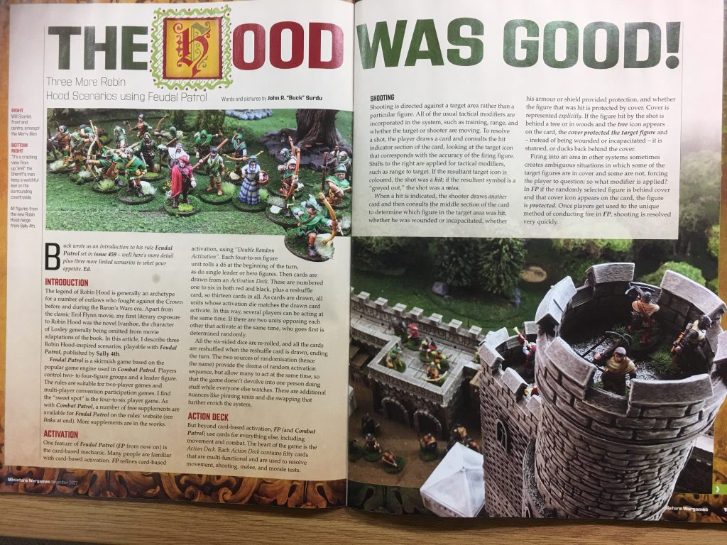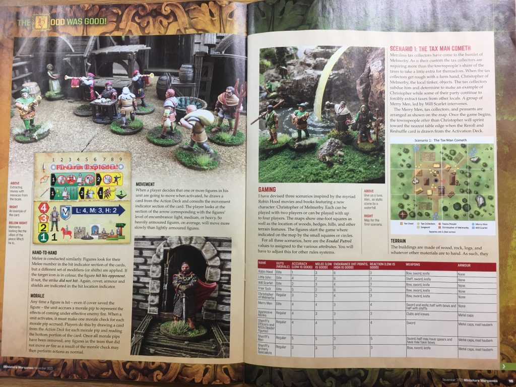 The November issue of Miniature Wargames (Issue 475) contains a fantastic set of 3 scenarios for Robin Hood themed miniature gaming using the Feudal Patrol skirmish set of rules, (although the scenarios could be played with any good set of skirmish rules).