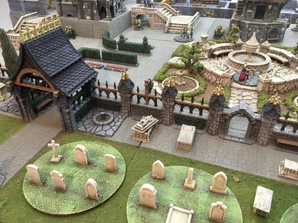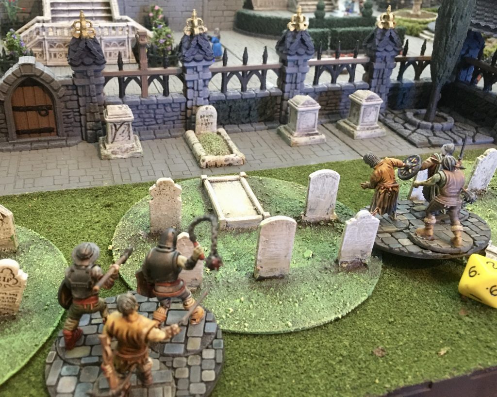 We had 6 mobs on the table. These represent the crowds of townsfolk going about there business. They are mounted on 60mm – 80mm round bases. We also had mobs of Zombies. The premise for the scenario was that some foul Necromancer had caused the dead to rise from there graves in the town’s graveyard, and rampage through the city in search of flesh to eat. There were 6 single based townsfolk. One of these was a ‘person of importance’ that the gangs were hired to escort out of town to protect from the Zombie hordes. Zombie ‘mobs’ moved around the table like normal mobs, but there reaction included an option to attack nearest fighter, stand still, or move randomly.