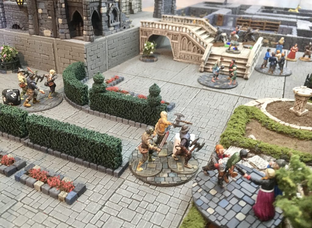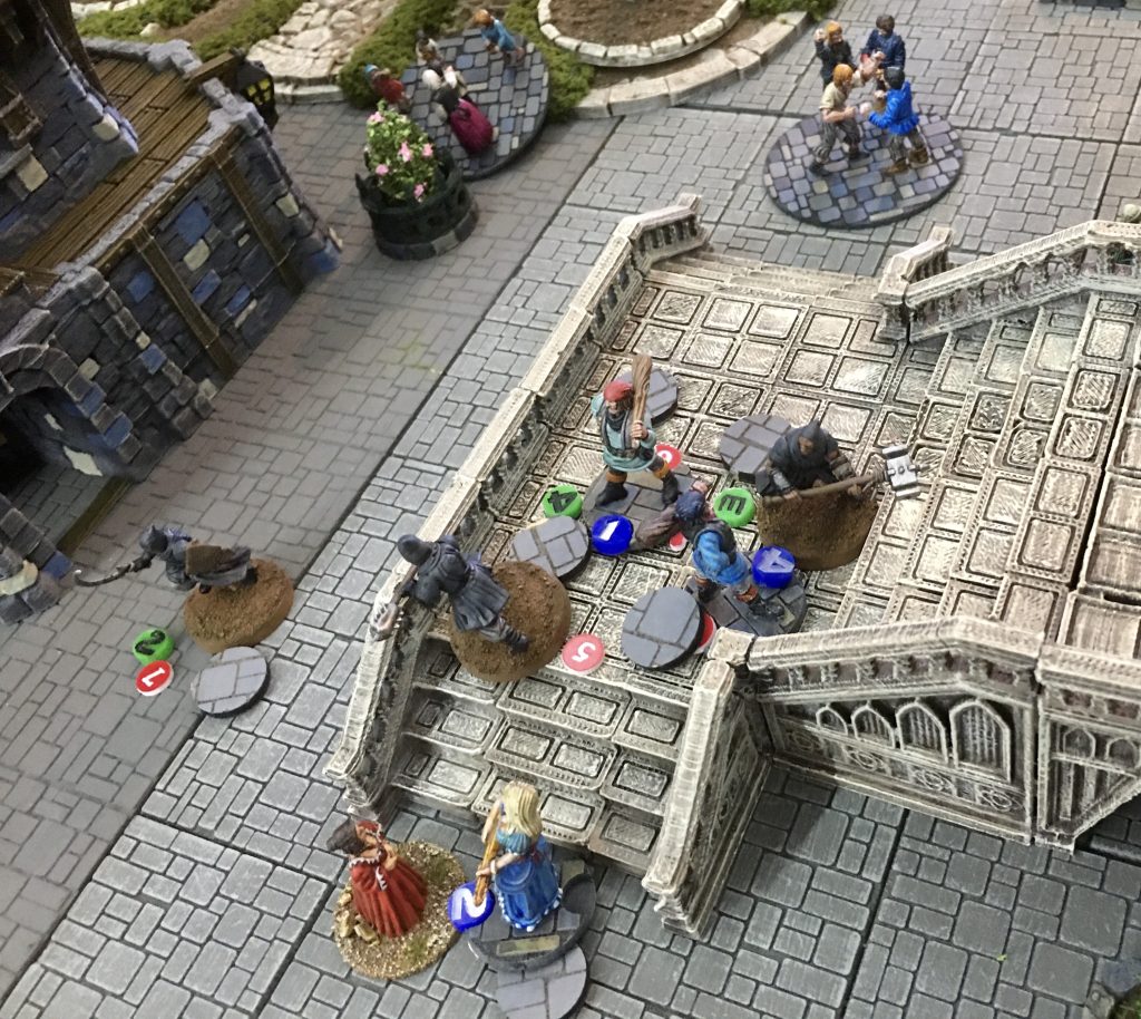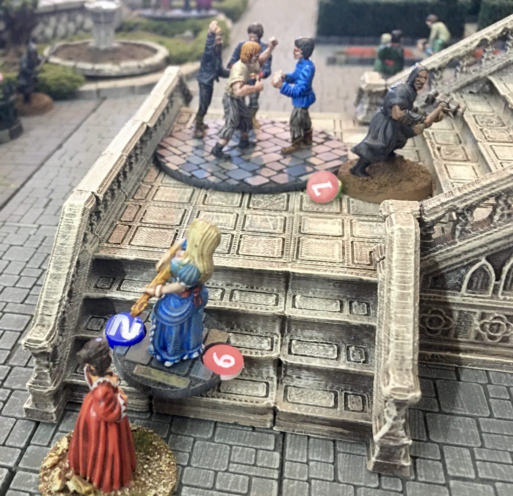 Mike’s gang can be seen advancing through the formal gardens. He already has a fighter close to Elizabeth, who is attempting to take control of the Lady. His other characters are about to ‘blend’ with the crowd to move quickly to lend a hand.