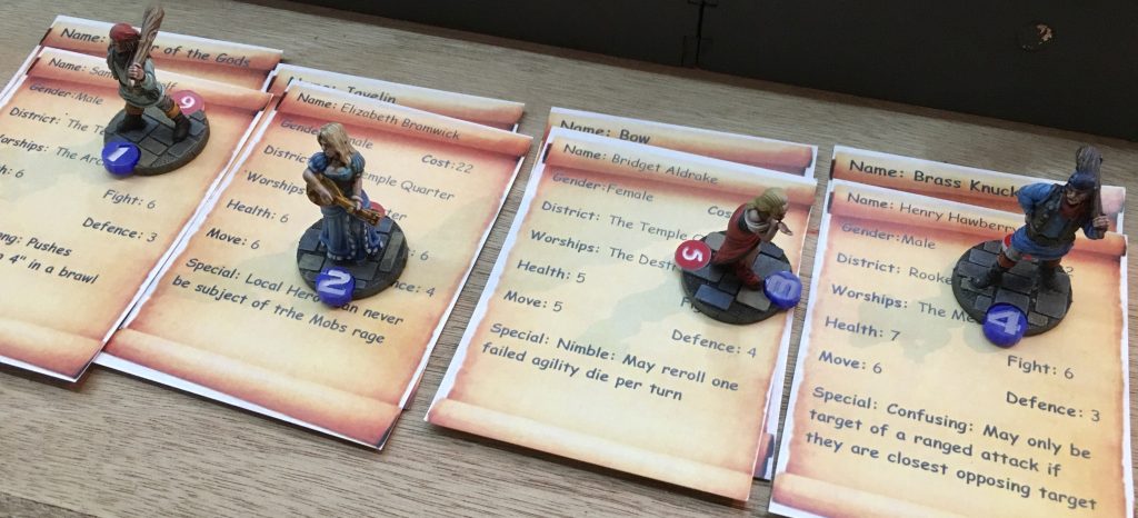 The game that we played used 100 point gangs. This allows you to field four fighters with some points over to buy some gear. All fighters are assumed to come equipped with a basic melee weapon (something like a cosh or a dagger). Additional equipment can be brought and is held in a pool and equipped to fighters as they need it. I have made some special bases that have a nice embossed flagstone effect and hold an ID number and a health marker. The order of the cards on the table denotes the associated figure, for example the 3rd character card from the left is Bridget. The miniature for Bridget has a Blue 3 Id. Bridget’s health is 5 so she has a red 5 health marker on her figures base. You can click here to take a look at these and other special flagstone bases and movement trays I’ve made for the game. Mike’s figures used a different colour (Green) for there Id markers.