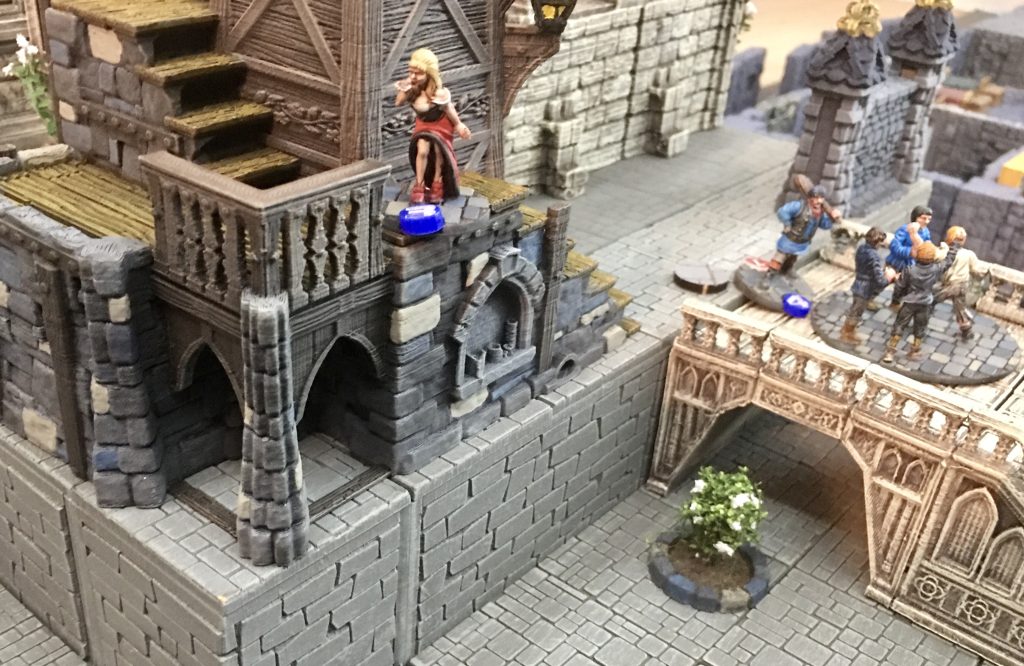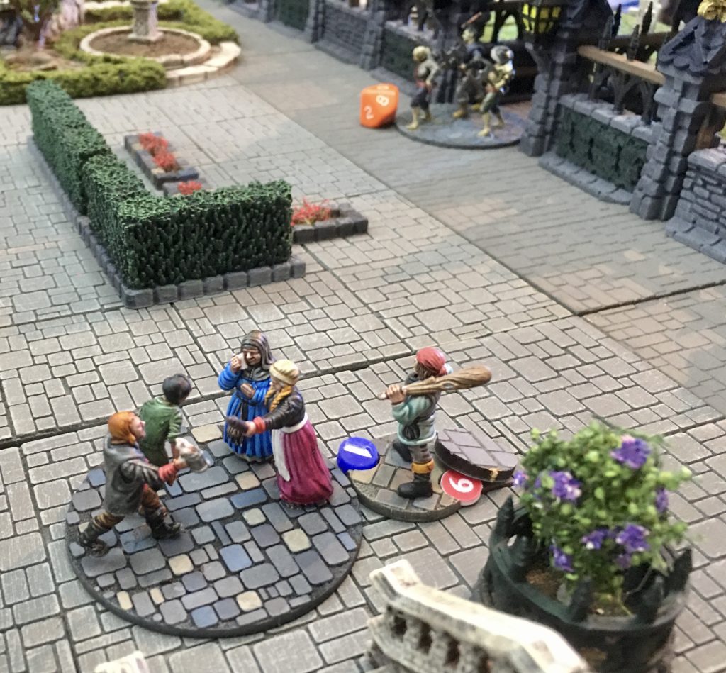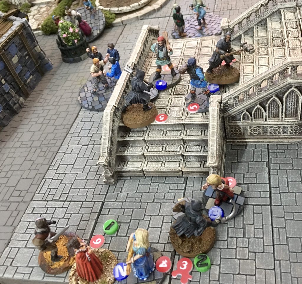 I had equipped Bridget with a bow and quickly moved her to a good vantage point for covering the table. Henry (Blue 4) has moved up to a mob and is about to ‘blend’ with it. This allows him to disappear into the crowd and on a subsequent turn exit from any mob base on the table.
