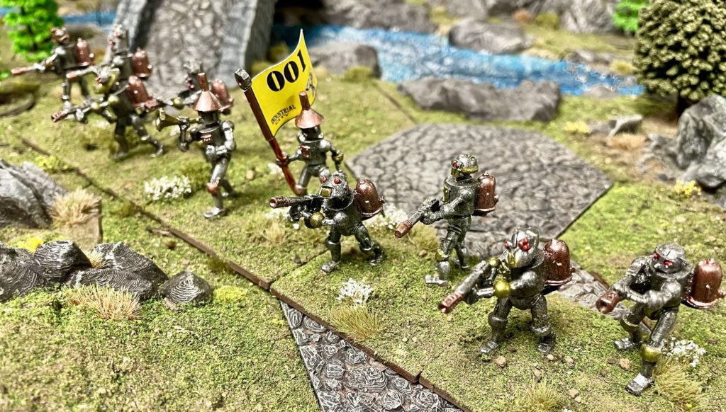 Professor Nitpick is a great innovator and has designed a wide range of weapons to arm his mechanical men including flame shooting Napalm projectors and Plasma blasters. The robots are equipped with clockwork brains enabling them to work in formations with a precision to match many regiments of living soldiers and there armoured shells give them an impressive resilience to small arms and melee damage.
