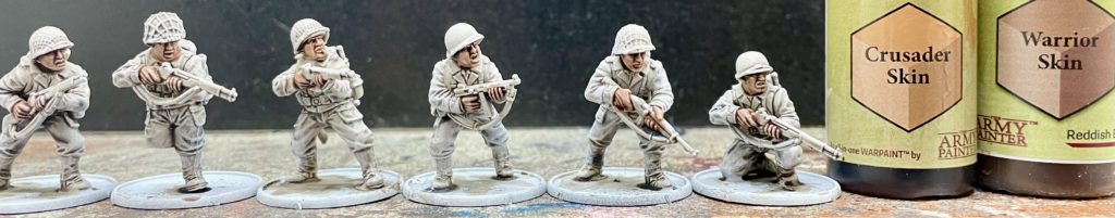Faces and hands were painted first. You can use your favourite flesh tone. I used 2 drops Crusader Skin to 1 drop Warrior Skin. I like this when I am painting figures that look like they’ve spent some time outside.