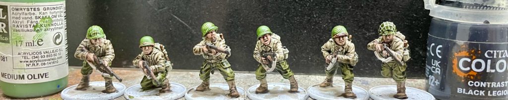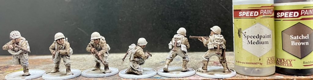 The only parts not painted using SpeedPaints were the helmets and bazooka. These were painted using Vallejo Medium Olive. Metal parts on weapons were painted Black. I used Citadel Contrast Black Legion because I like the way it flows and covers, but any Black will do!