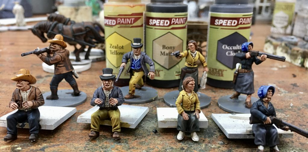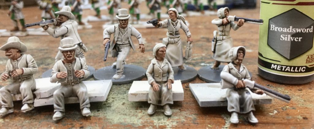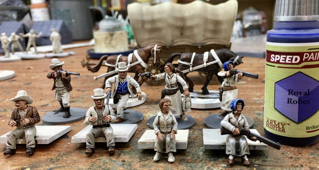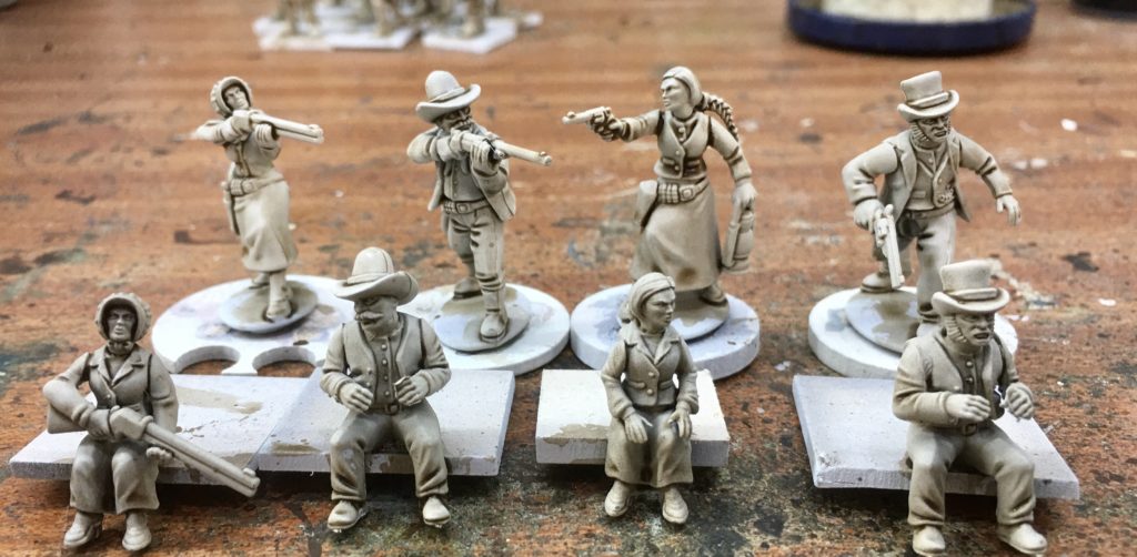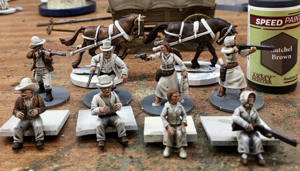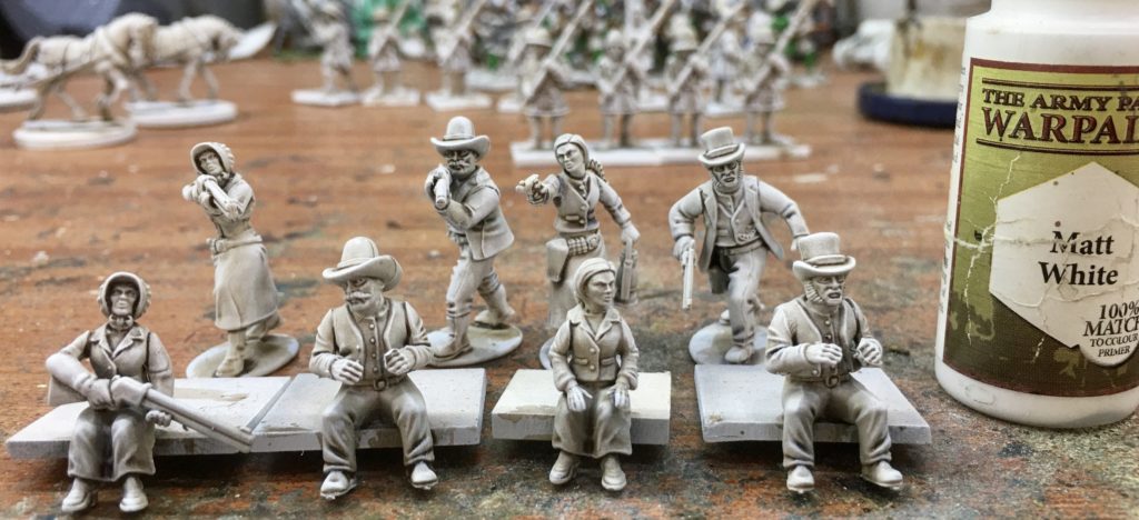 The left hand miniature has had a set of shotgun carrying arms added from the female gunfighters set. The standing bodies are also from the female gunfighters set with the two alternative female passenger heads from the wagon set added. The right hand wagon driver has had a head added to match the standing version from the plastic gunfighters set. Figures have been glued onto temporary painting bases and have been spray undercoated using Halfords White Auto Primer. Once dry a brown / sepia ink wash has been applied to bring out the detail and assist with the shading and highlighting.