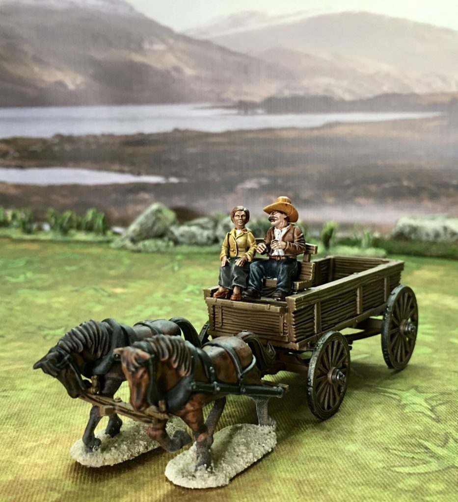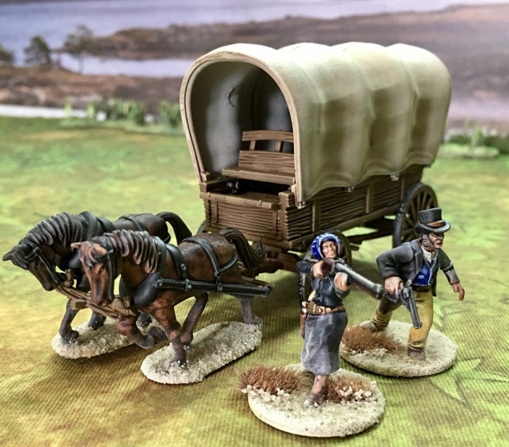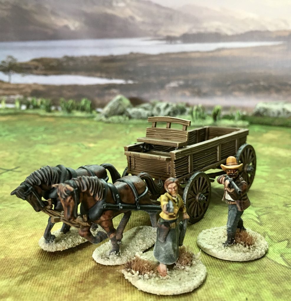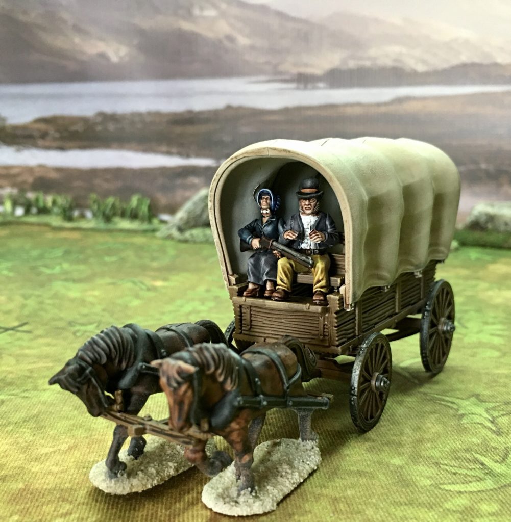 The wagon comes as a kit with two horses and two figures, each with a choice of two heads, but they have also made the wagon available without the horses, canopy or figures if you want some parked up as terrain.