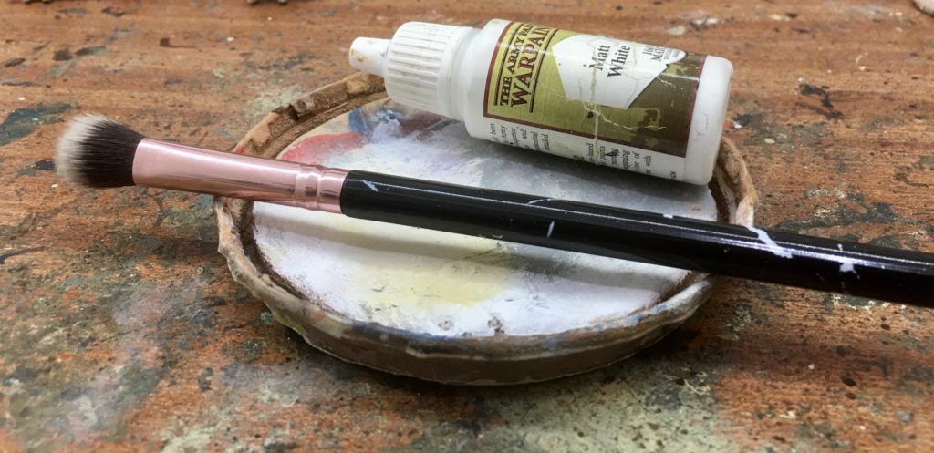 When the ink wash is completely dried, matt white acrylic was drybrushed over the miniature using a medium sized make up brush. These are ideal for drybrushing miniatures and terrain and cost a fraction of the price of specialist hobby brushes.