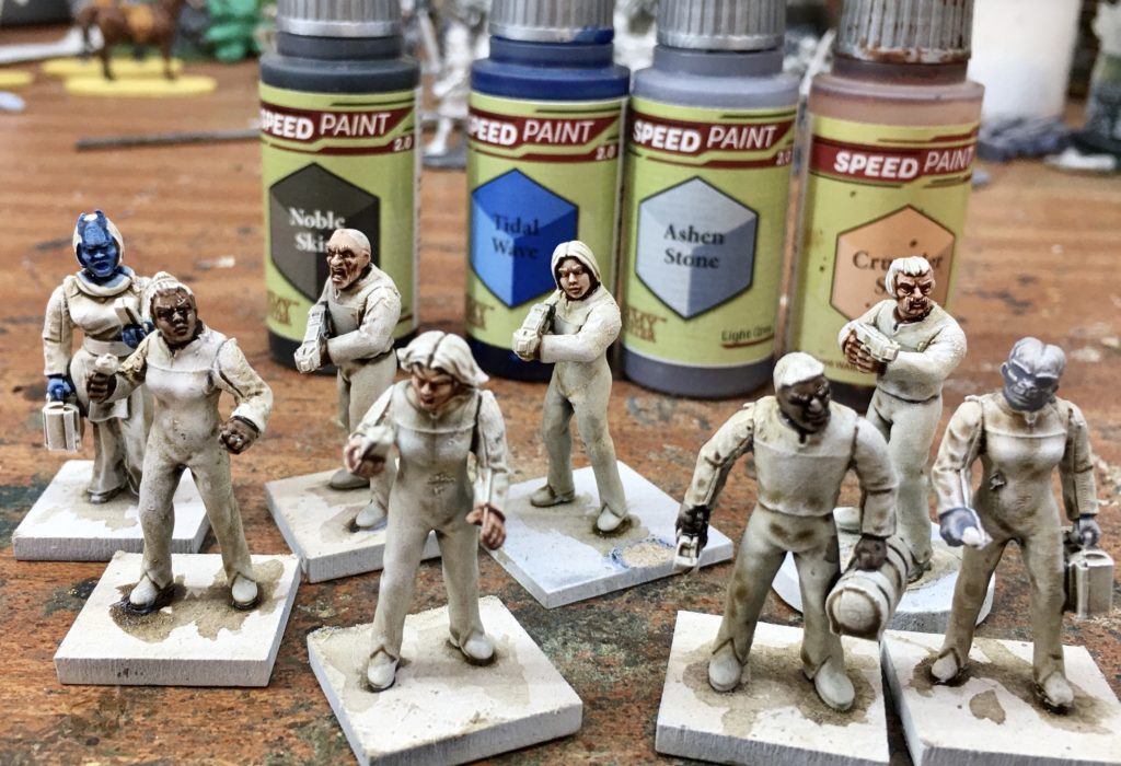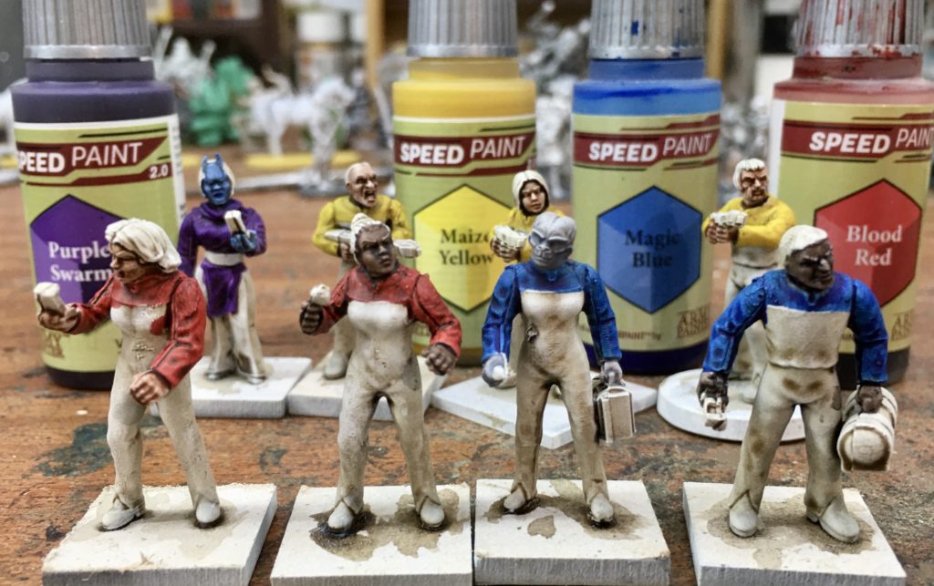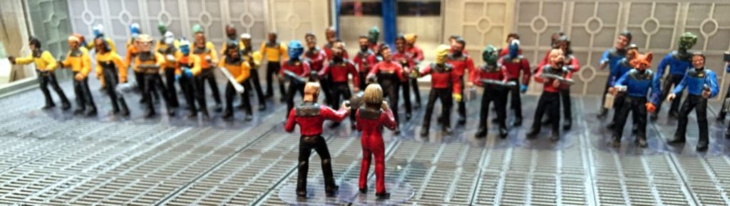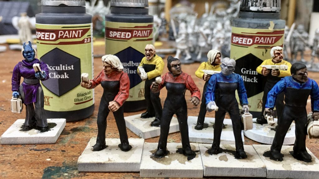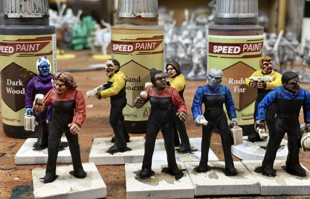 Next to assign them to Divisions. I’ve decided that our landing party is going to consist of the XO / No 1 and a Helmswomen from Command Division, a Doctor and a Science Officer from Science Division and three Security Officers from Operations Division. Ops Division gets painted Blood Red, Science Magic Blue and Ops Maize Yellow. Our civilian NPC, Veshia gets a Purple Swarm coloured top.