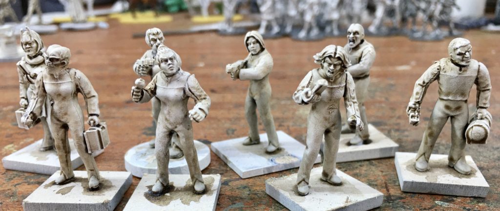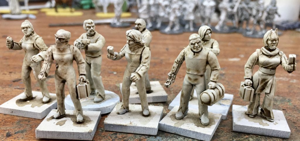 Yesterday I was sitting at my desk, thinking that I would very much like to start a new Star Trek inspired Pulp Alley campaign. We have played many Star Trek themed games in the past, it is one of my favourite genres, so it made sense to me to have a new crew for a new campaign. This would not make sense to everyone, my wife included, who would say “… but, you’ve got hundreds of Star Trek crew already”. This is true (to a degree), however as Sally 4th has an ‘inspired by Star Trek’ range (Landing Party), which includes a wide range of non-human heads, a lot of the crew are…. non-human. This is also fine, subscribing to the Vulcan philosophy of IDIC (Infinite Diversity in Infinite Combinations) we welcome the wide range of species serving on our model starships, but humans were a bit under represented, so I decided to put together a mainly human team using Sally 4th Landing Party heads and arms with phasers, tricorders, engineering supplies etc. but to use human heads from my bits box. The heads came from Frostgrave Wizards and Stargrave Crew Two, plastic box sets.