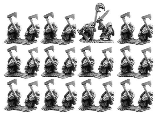 24 x Dwarfs with 2-handed axes including a leader and a standard-bearer. The Dwarfs are about 9mm tall.