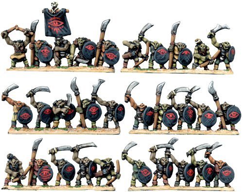 1 x command strip plus 5 Orc warrior strips. The Orcs are 9-10mm tall. Strips supplied as random variants. Painted by Kevin Dallimore.