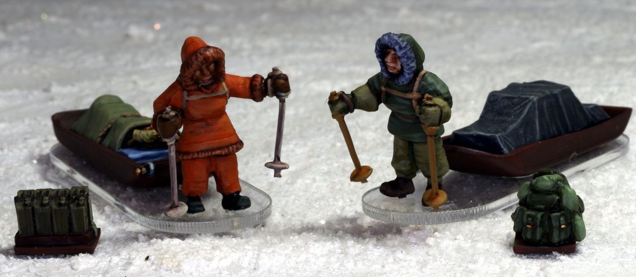 Set contains 2 x 28mm scale metal miniatures with ski poles, sledges and an assortment of loads for sledges