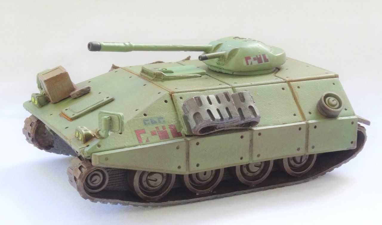 One variant that is included is the AV8F. The AV8F is a fire support vehicle, usually referred to as a FIre Support Team (FIST) vehicle. The FIST vehicle is fitted with a turret that replaces some of the crew compartment, leaving space for four armed critters as well as the driver and commander/gunner. FIST vehicles are used two ways, either as a reconnaissance vehicle, carrying a half squad of critters for recon on foot or to provide security; or as part of a mechanised infantry support platoon, carrying a heavy weapons crew. Typically, the single person turret mounts a 30mm liquid-fuelled cannon and a 10mm HKMA 2-50 machine gun in co-axial mounts. However, some variants sport two PML tubes as well as the cannon – but it is not known if this was standard, or a field modification. This variant is referred to as AV8F2. Later War Improvements In Phase IV, the AV8G became standard, mounting a remoted turret with an HAKW 2-50 fitted. The remote turret helps to minimise crew exposure, and is controlled by a limited AI that is tasked by the driver – this reduces crew work load overall, while allowing every vehicle to be armed and still carry a full complement of troops. The FIST vehicle was also updated, using the laser technology fitted to the Aero 4 Aerodynes to replace the cannon in the AV8F3 variant. AI was retrofitted to many vehicles in Phase IV and afterward, performing all manner of tasks to support the crew and commanders, and making the vehicle and force more effective..