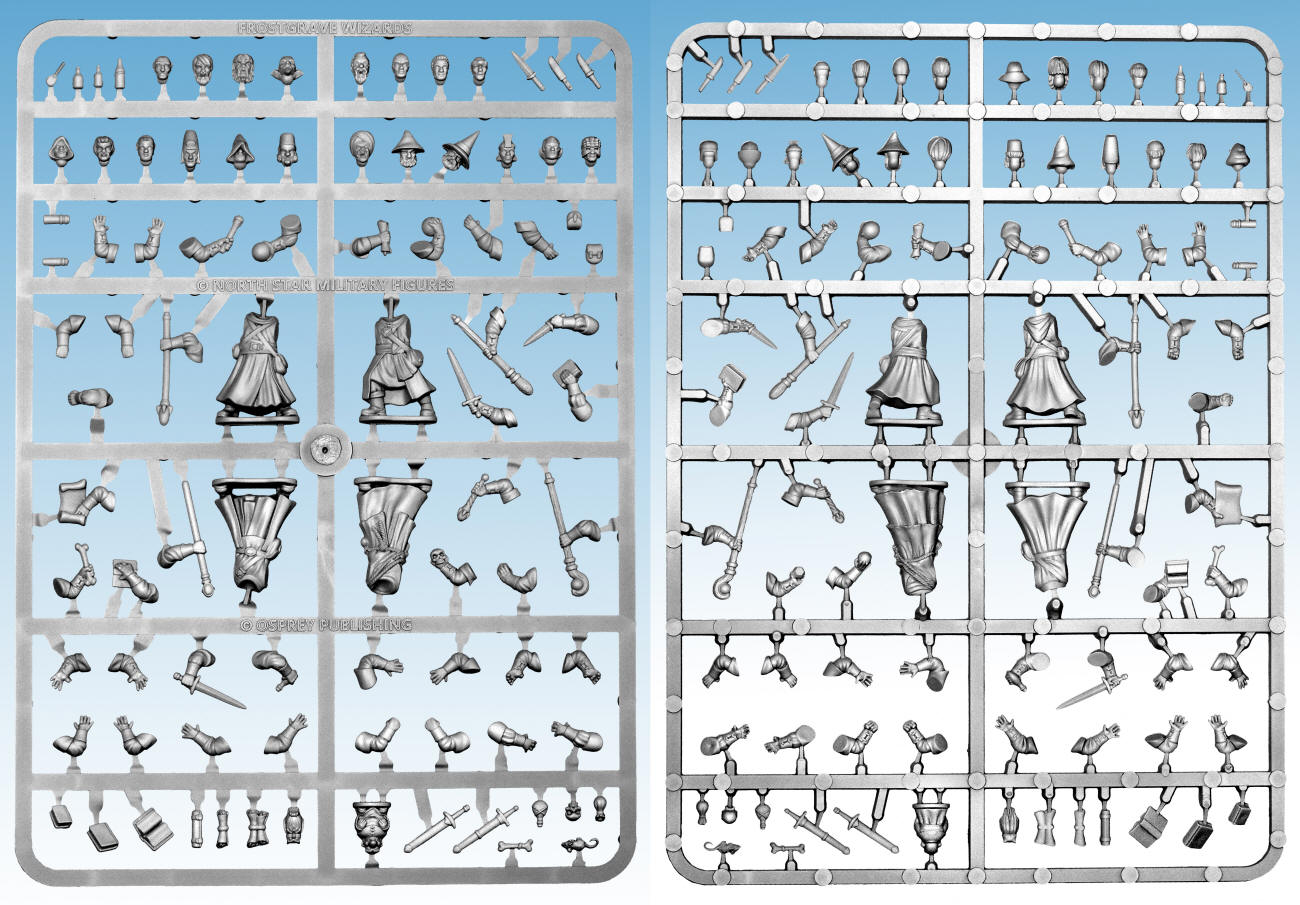 This sprue allows you to build 4 different models to play in the game Frostgrave.  It includes a wide range of heads, arms, equipment, and familiars, and is also compatible with the Soldiers, Cultists, and Barbarians boxed sets.