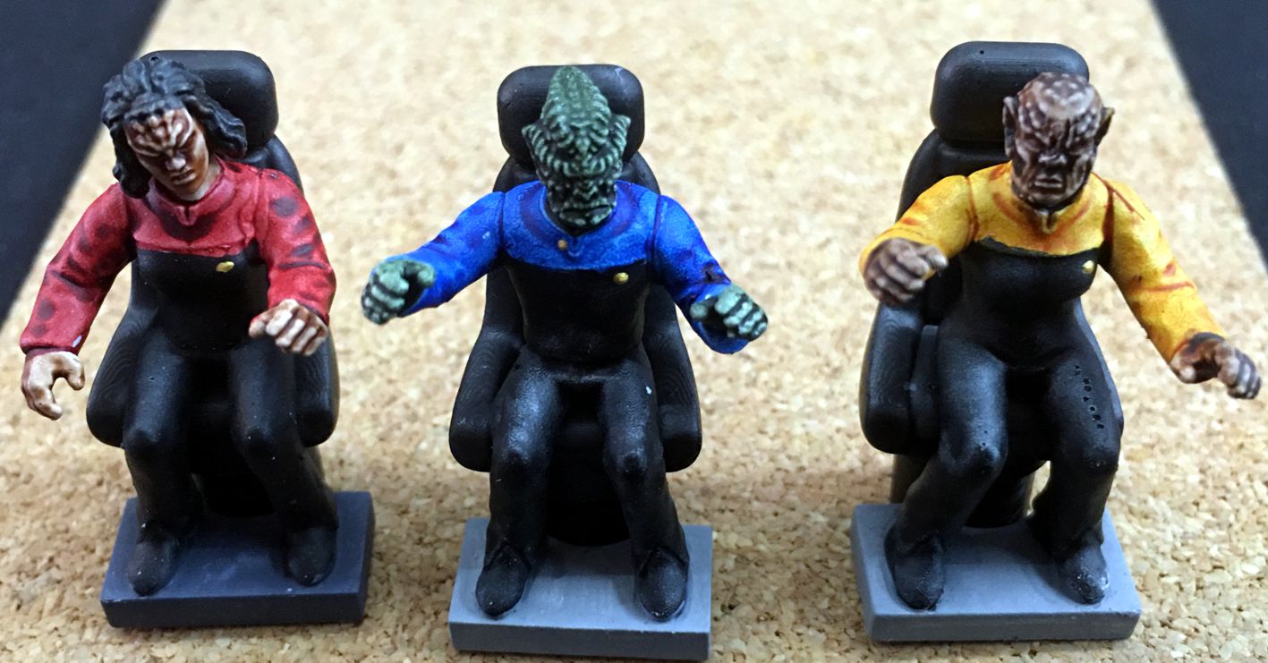 Chairs can either be used ‘stand alone’ or fitted on to the chair posts on LV-472 terrain pieces including Large Bridge, Command Center, Transporter Room, Cafeteria etc. Chairs have been designed to work with Landing Party Seated Starship Crew pack.