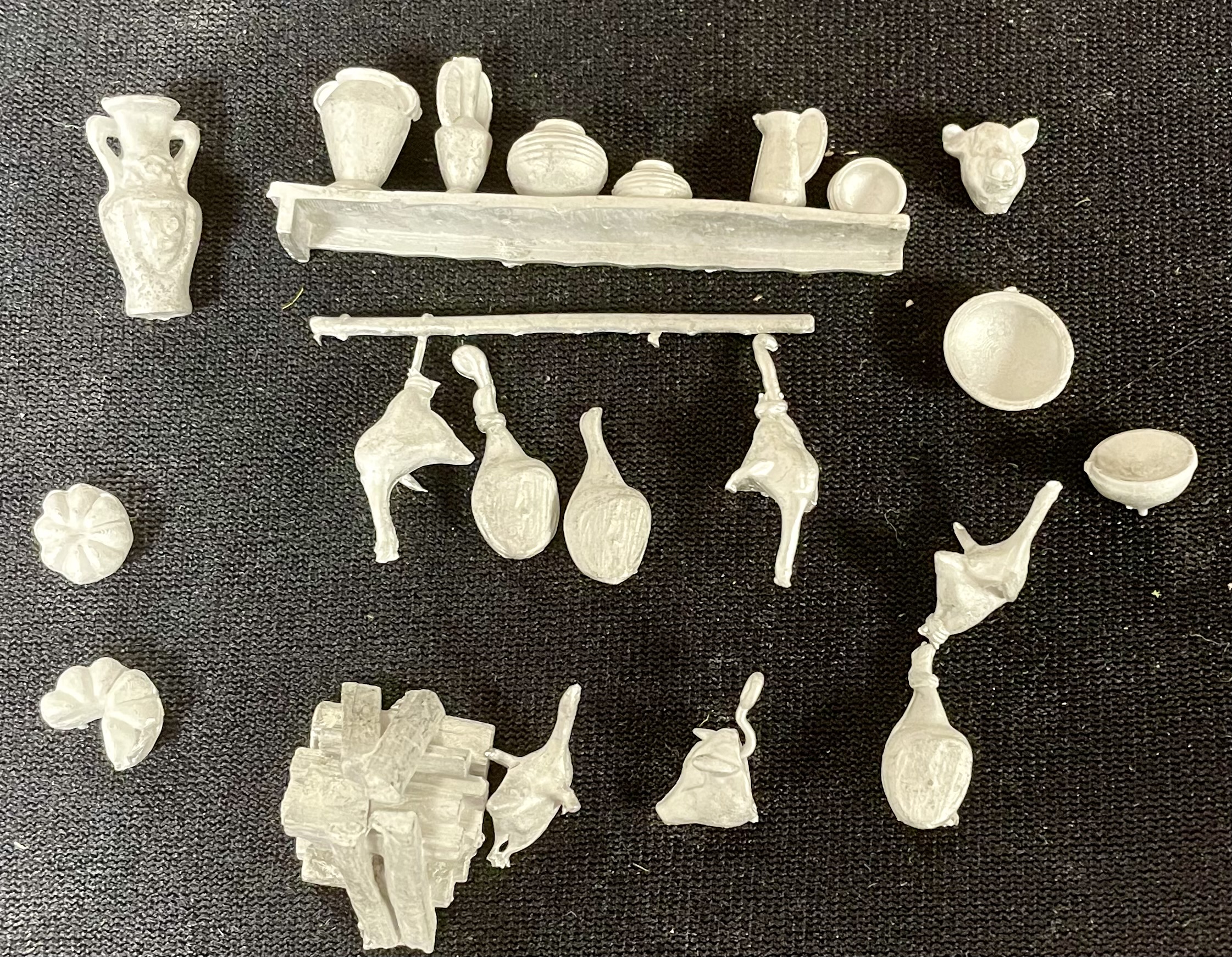 Shelf of pottery, fire wood, roman bread, legs of ham, poultry, hanging rail, bowls & amphora.