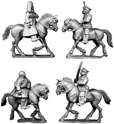 Smarter versions of grey uniform. Rank shown by number of red stripes down trousers or silver and gold stars and stripes on shoulder bars. Collar tabs/shoulder bars: yellow – cav. Random selection of 3 figures from the 4 shown. Horses supplied as random variants.