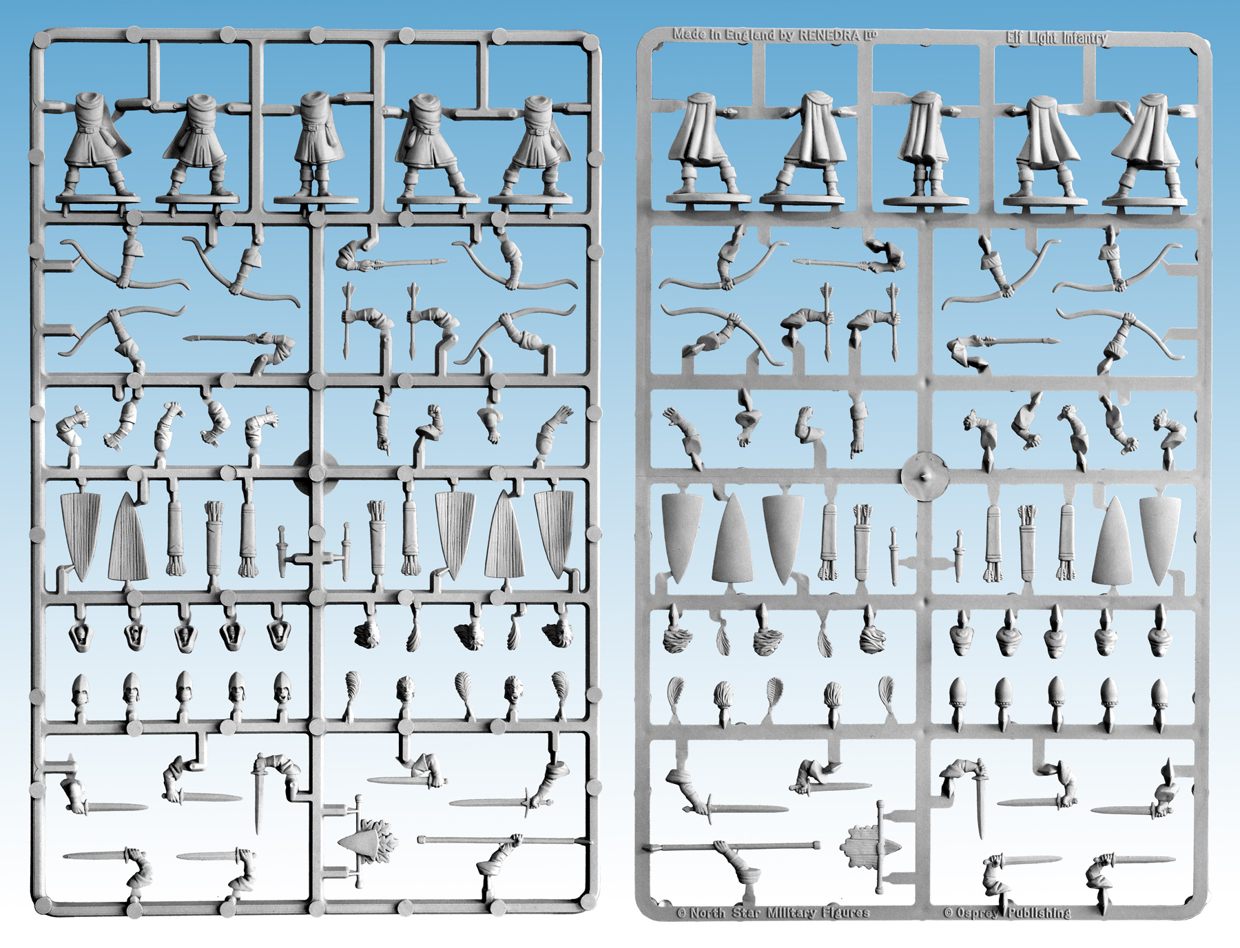 This box set contains enough parts for you to build 30 Elf Light Infantry. We provide you with enough weapon options to make them all hand weapon and shield, all archers or any combination of the two. Each frame also contains a standard bearer and officer option. So you could have a giant unit of 30 Elf soldiers with an officer and standard bearer, or six units of 5 Elves with mixed weapons and a standard/ officer each!