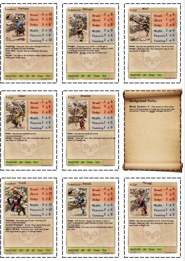 Character Cards based on Frostgrave plastic Female Cultists and Barbarians.