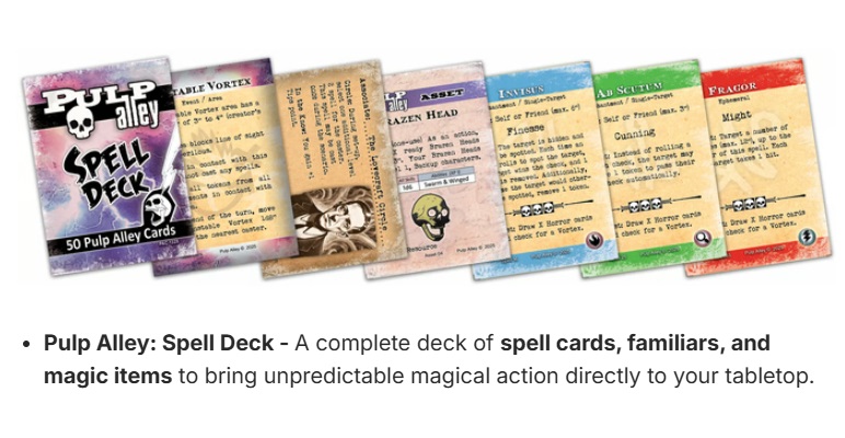 Pulp Alley: Spell Deck – A complete deck of spell cards, familiars, and magic items to bring unpredictable magical action directly to your tabletop.