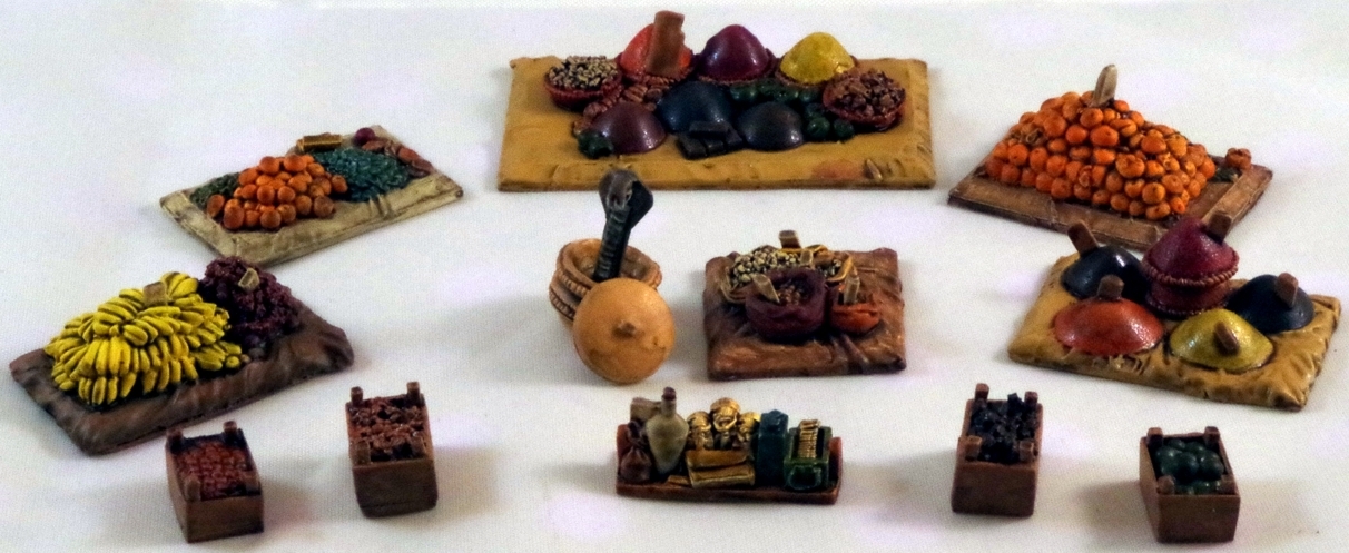 Set contains nine detailed resin castings designed to complement the market stall from ‘The Souk: Set Dressings Set’