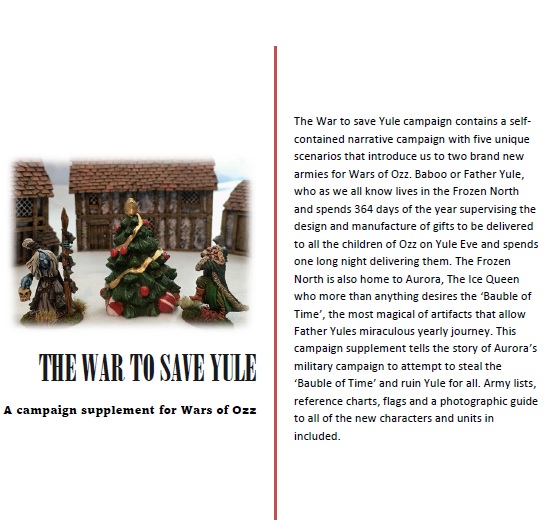 The War to save Yule campaign contains a self-contained narrative campaign with five unique scenarios that introduce us to two brand new armies for Wars of Ozz. Baboo or Father Yule, who as we all know lives in the Frozen North and spends 364 days of the year supervising the design and manufacture of gifts to be delivered to all the children of Ozz on Yule Eve and spends one long night delivering them. The Frozen North is also home to Aurora, The Ice Queen who more than anything desires the ‘Bauble of Time’, the most magical of artifacts that allow Father Yules miraculous yearly journey. This campaign supplement tells the story of Aurora’s military campaign to attempt to steal the ‘Bauble of Time’ and ruin Yule for all. Army lists, reference charts, flags and a photographic guide to all of the new characters and units in included.