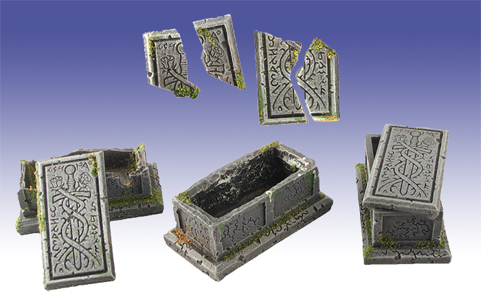 Someone’s been robbing graves, or maybe vampire hunting…? Set of 3 resin sarcophagi with metal lids