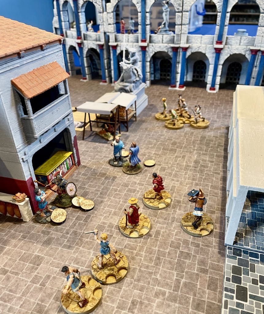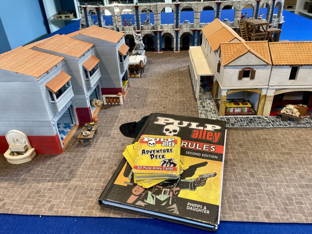 Mike and I got together this morning for another exciting game of Pulp Alley. Pulp Alley is a game that I have been playing for the last twelve years or so and it never fails to deliver a tense and engaging tabletop miniatures game with a compelling narrative. Today our game is set in AD74 in Vespasian’s Rome, although it could well have been set in another time or place as Pulp Alley can and has been used to game anything from Cavemen to Spacemen with just about every period or genre in between. For many years, both Mike & I have been captivated by the skilful story telling of Lindsay Davis, who brings Rome to life through the eyes of Marcus Didius Falco and the lovely Helena Justina. Falco is a first century Private Investigator, an Informer who travels the width and breadth of The Empire solving crimes and outwitting his arch nemesis, Anacrites, The Chief Spy. The style of Lindsay Davis’ writing, is that of a Pulp ‘Gumshoe’, so ‘Falco’ works very well as a Pulp Alley game.