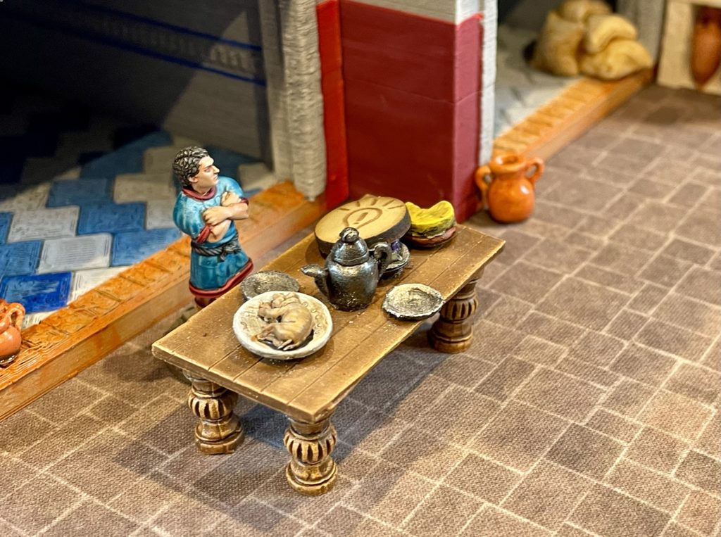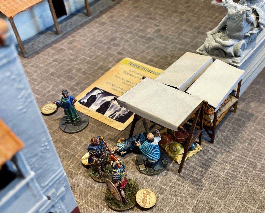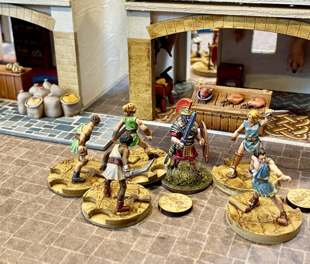 In the second turn Falco was well placed to investigate the Amphora of poisoned Wine (the cursed object plot point). Attempting the plot point was an action, so Falco ceases to be hidden and at the end of the turn the Guardsmen comes over and attacks him, but by then he has slipped the Amphora into a fold in his tunic.