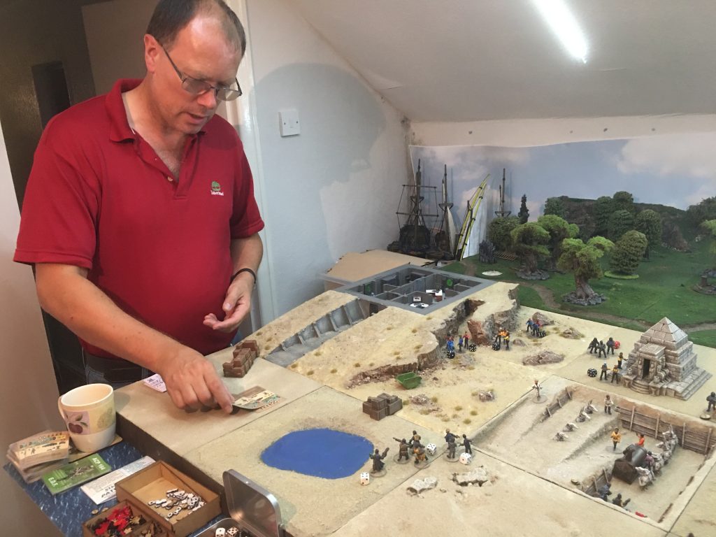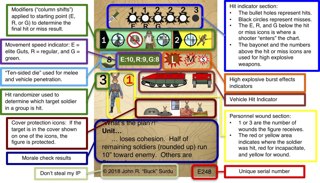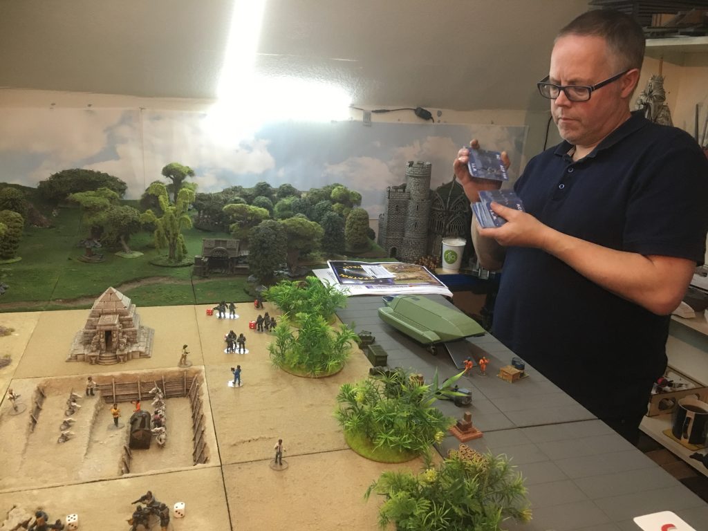 Doug is using his action deck to resolve some shooting. Troops are classified as either Green, Regular or Elite for shooting. This determines where you start on the shooting resolution part of the card. Shifts are then used to reflect the tactical situation, so for example if your target was at medium range you would shift one, if your target was at long range you would shift two. Looking at the card above, if our shooters were regular they would start in position two, shift two for a long range target needing a hit token in the fourth position for success, which the card had. Once you’d worked out if a hit had been scored a second card would be turned to determine who in target group had been hit, if cover would save them and the severity of there injury.