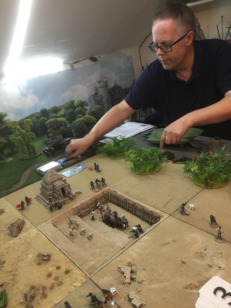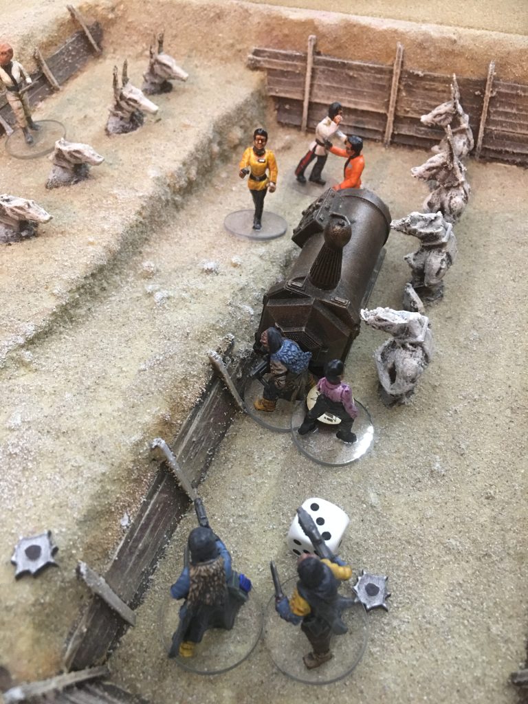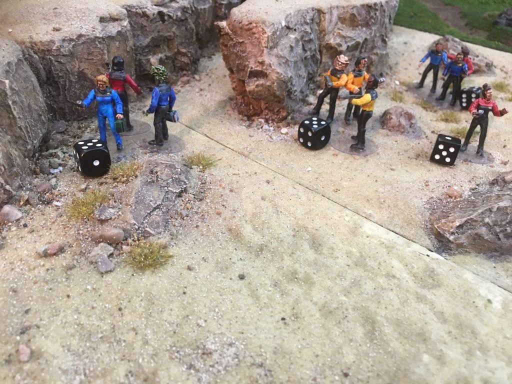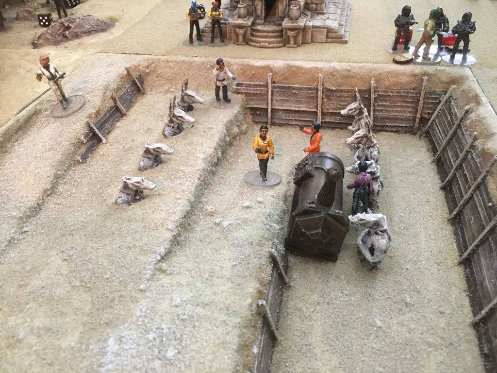 One of the great things about Star Trek gaming is that the scenario could be set just about anywhere so a perfect excuse to use my archaeological dig site terrain together with a landing strip and an underground bunker. There were locations assigned within the dig site and the bunker where data about the power source could be extracted by science team personnel. To gather the information the officer needed to activate next to a data point (like the equipment in the dig site) and draw an action card, and refer to the Hit Indicator Section, which has bullet holes that represent hits and misses. Cards have from 0-6 hits plus an ‘out of ammo’ result. Four hits were needed to be successful, hits carried over from one activation to the next so if 2 hits were gained initially a further 2 would solve the problem, but an ‘out of ammo’ represented a technical set back meaning that the character needed to start again from zero.