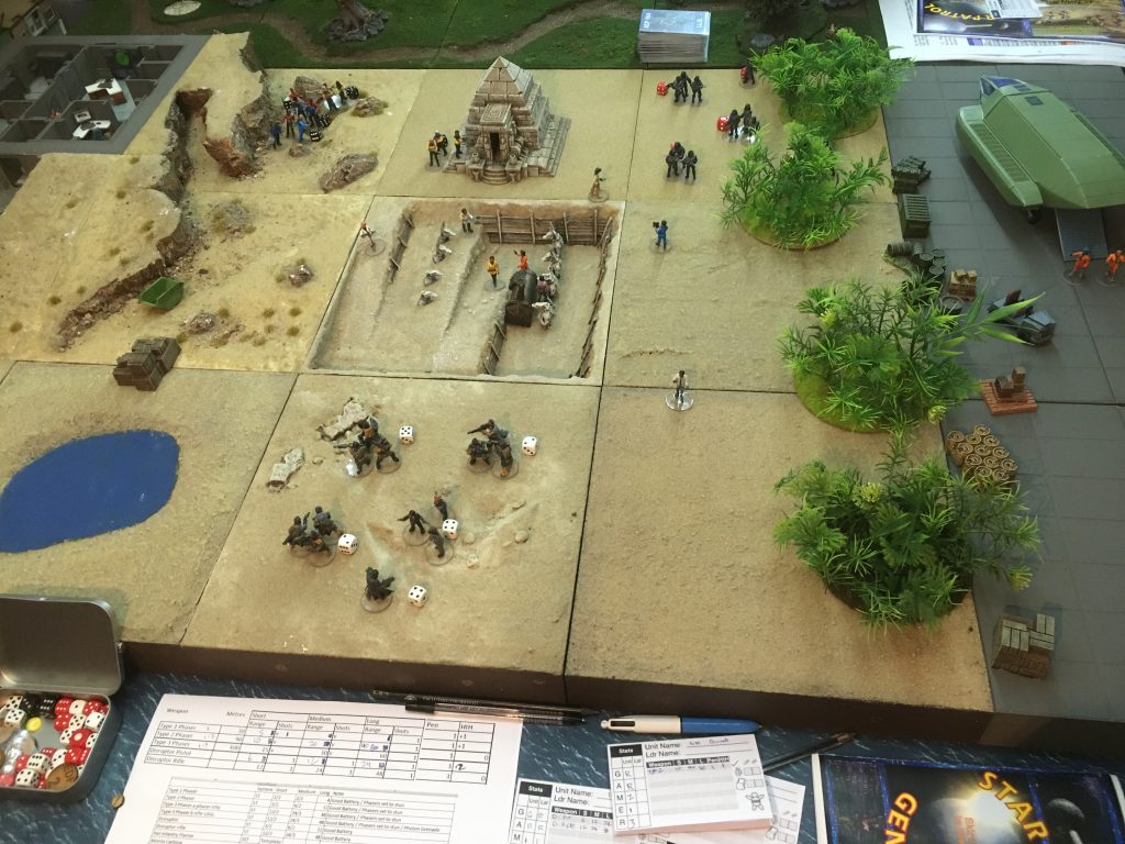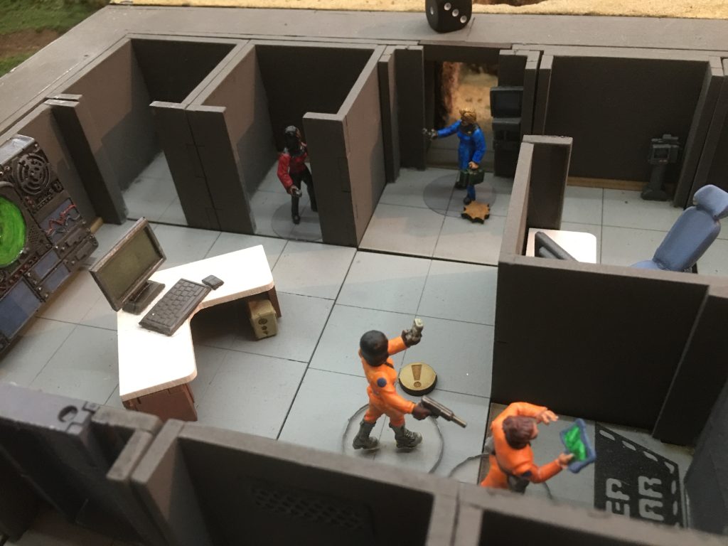 Points were also gained for rescuing or capturing for interrogation or negotiating a trade deal with one of the scientists from the dig and escorting them back to the shuttle or teleport enhancer. The civilian scientists were scattered around there office bunker and the dig site as were there security contractors who responded to any faction entering there terrain tile. This led to a suitably chaotic three way engagement with lots of potential objectives.