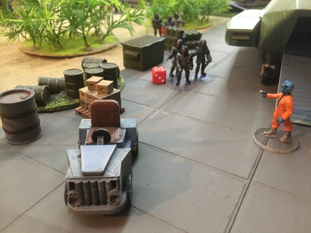 I’d not got a unit of Ferenghi Pirates (yet), so these Klingon Pirates are standing in for them! The pirate by the machinery has captured a scientist while his two comrades are using cover and returning fire.