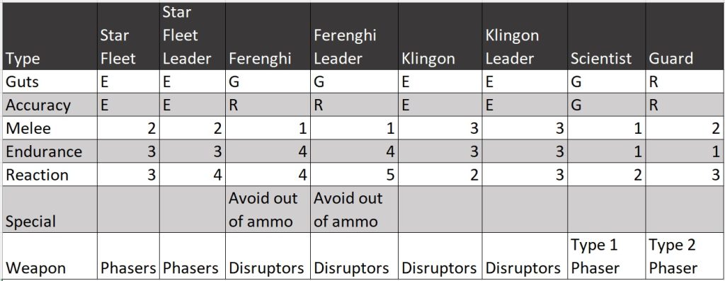 These are the stats that we used for the game. These together with the Star Patrol:Genesis rules, that can be downloaded by clicking here are all that you need to do some Star Trek themed Skirmish Gaming. Our thoughts were that Star Fleet Personnel were very well trained and had access to the best shooting technology. Phasers have in built targeting AI that makes them very accurate. The Ferenghi are not as well trained at shooting and are armed with Disruptors which are less accurate, have less range, but are more vicious if they hit. They have the lowest possible melee value as they do not like to get in a scrap, but they have high Endurance which reflects that they are very good at hiding which gives them an edge on survivability. They are very aware of there environment so have a high reaction score and we gave them a special rule to ignore ‘out of ammo’ results as we thought that they would have traded all the phaser and disruptor batteries and kept the best ones for themselves! The Klingons are also excellent shots and are also tougher in melee. The civilian scientists and guards were given an Endurance of 1 as we decided that they would surrender if wounded in any way.