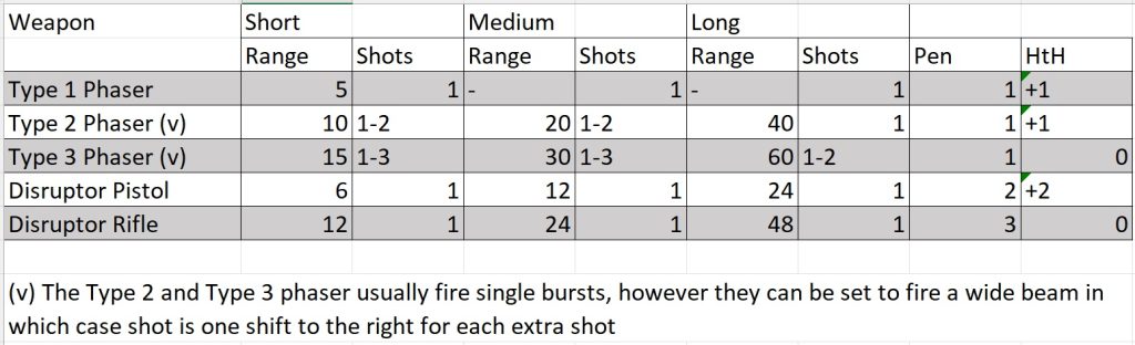 The Type 1 Phaser is a small easily concealed device with limited battery life that is really only useful for self defence within close range in a ship or office, however it does still have sophisticated AI targeting so we set range to 5″ but all shots counting as short range.