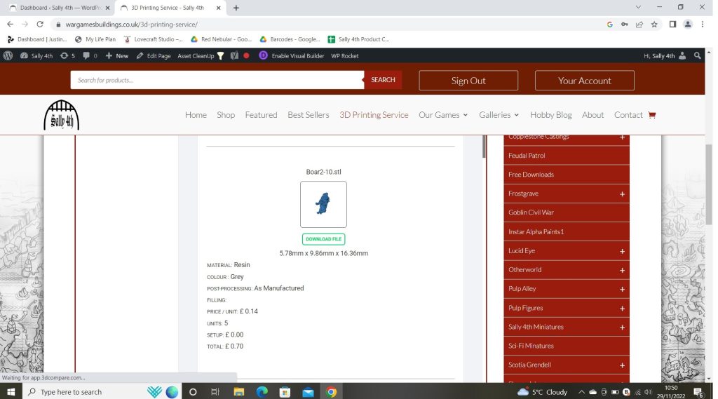 There is a utility on Sally 4th website, where you can order 3D prints. Click here to take a look. It is very easy to use. It is where I get all my 3D models printed. I choose Resin as the material and Grey as the colour. It normally take 2-3 weeks for printed orders to be turned around. I reduce 28mm miniatures to 34% in the ‘slicer software’ and then export as a new 10mm sized STL. This reduced scale file is then uploaded to be 3D printed.