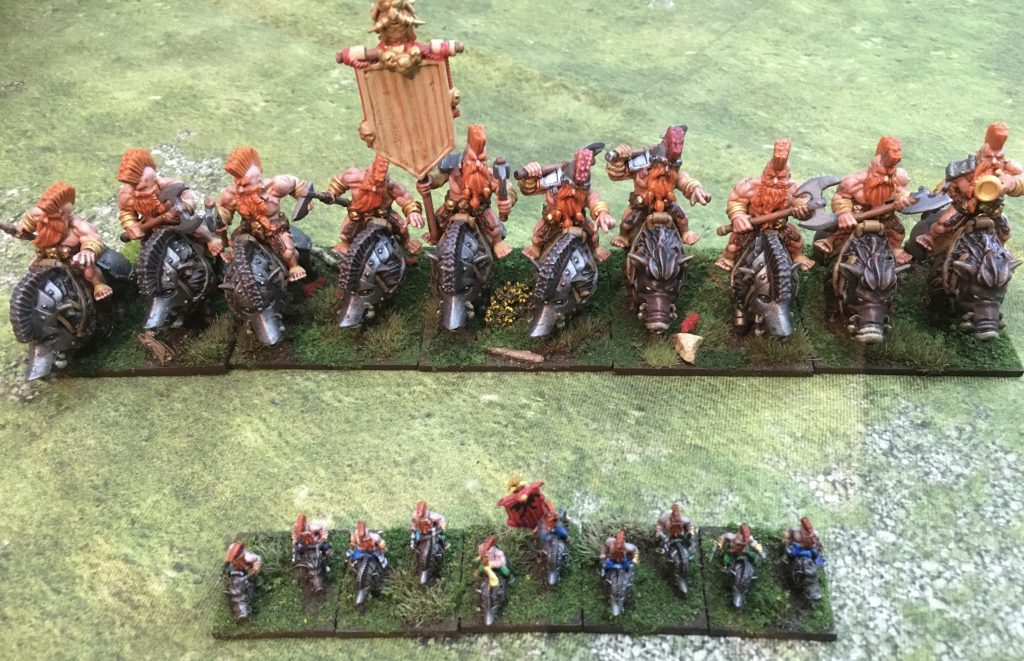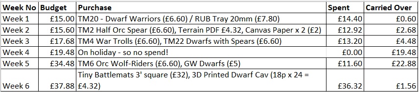 I had £22.88 carried over from last week plus the weekly £15 budget. The 3′ square battlemat cost £32 and 24 Dwarf Slayer Cavalry cost £4.32 leaving £1.56 to carry over to next week.