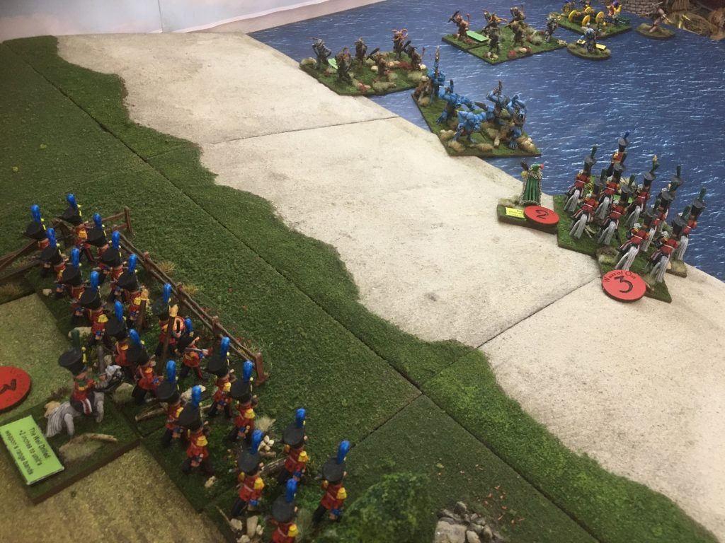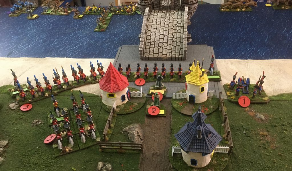 On the left flank Infantry and Cavalry also redeploy. The victory conditions for the scenario are not symmetrical. The Ice Queen scores points for exiting troops of the Northern table edge. The Yule army scores points for inflicting casualties that will weaken the eventual attack on the Workshops.