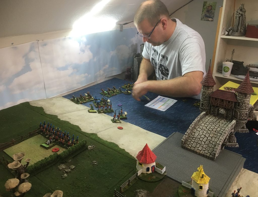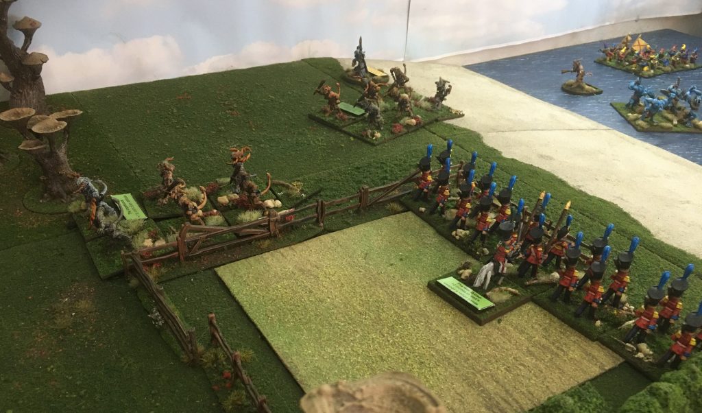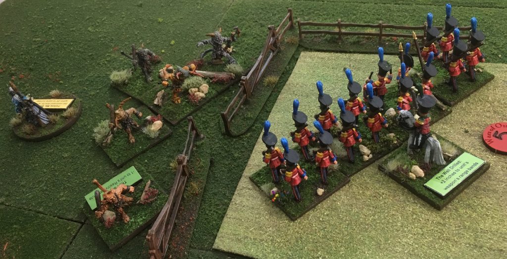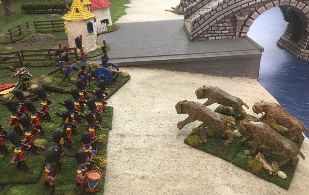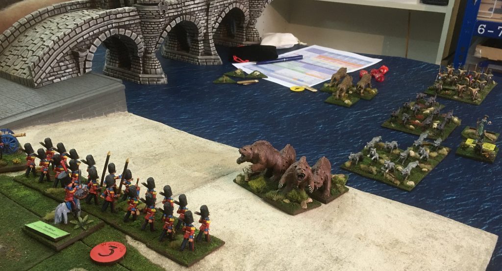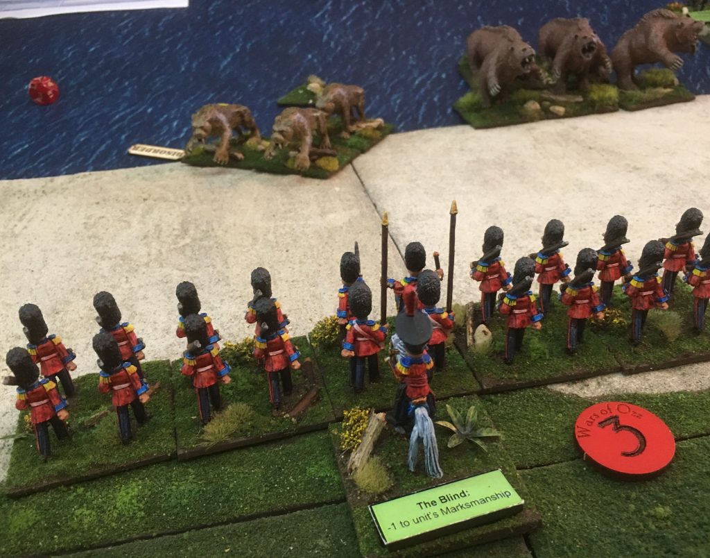 The combined fire of the Grenadiers and the Artillery was enough to force the Dire Tigers back Disordered, however, it was not long until the mighty Dire Bears were also closing with the Grenadiers. In Wars of Ozz each unit of Infantry or Cavalry draws a characterisation chit (to make them all a bit different), some are good, some are bad and some do not have an effect on the unit that they are drawn for. As you can see the Grenadiers are normally pretty good Marksman, but today they have draw ‘The Blind’ chit which reduces there effectivness. (Unlucky).