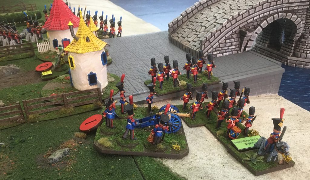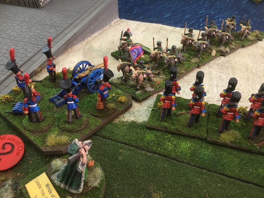 The battle was opened by the Toy Soldier Artillery, firing at long range trying to provoke the Ice Queens units to break off from the column and charge them. This proves to be a successful tactic. The Dire Tigers charge the artillery after losing a stand from artillery fire.