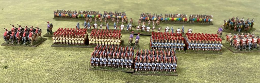 This is exactly the same army in 28mm scale. Same units, same bases. Miniatures are 28mm metal Wargames Foundry. If you were doing this sort of army today, you could use plastic figures which work out around £1.10 for infantry, £2.20 for cavalry, so this army would cost around £86 or about three times the cost of the epic alternative.
