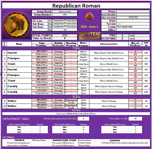 One of the games (other than Epic Hail Caesar) that I am planning to use these new figures for is Mortem et Gloriam. This is an army list I’ve put together for the figures I have painted so far at the Pacto scale.